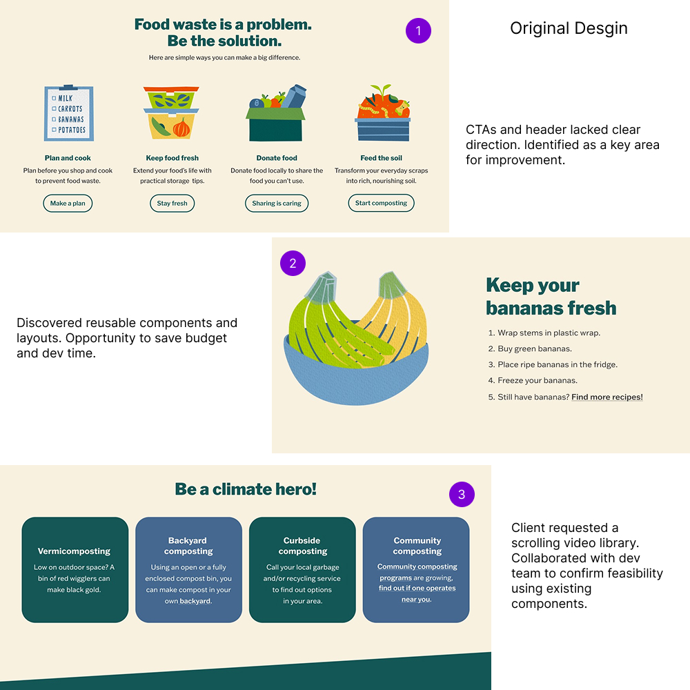 In the discovery phase, I reviewed analytics, the client brief, and the existing site structure to uncover pain points and define KPIs. On the homepage, I identified two key issues: unclear calls-to-action that left users without direction, and critical content about saving food and money hidden within a video. These findings shaped my redesign strategy to prioritize clarity, scannability, and accessible pathways for users.